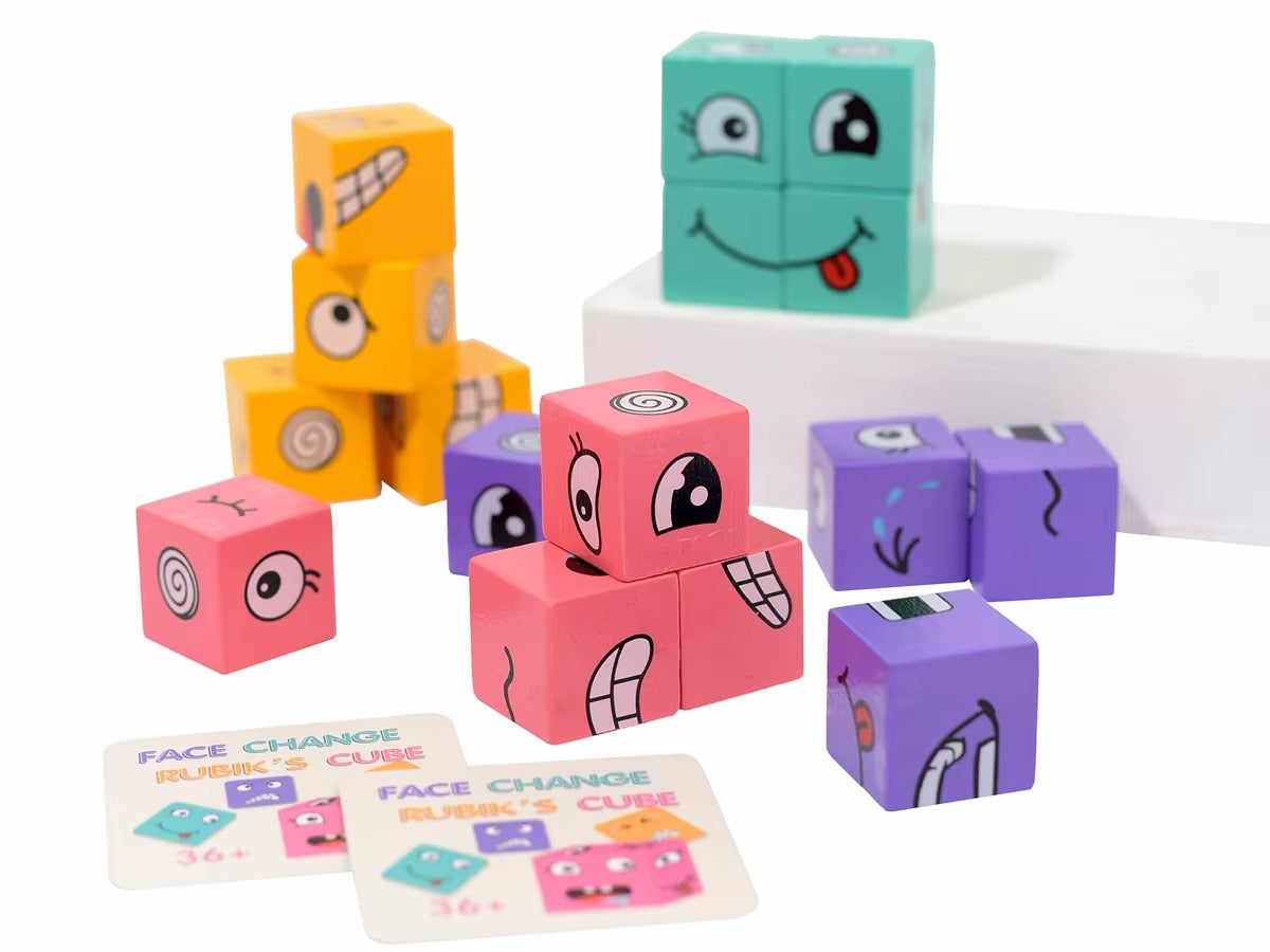 An Emotional Intelligence (EQ) trainer disguised as a fast-paced puzzle. The Challenge: Decipher complex facial expressions and replicate them. The Gameplay: Flip a card and rotate your wooden cubes to match the emotion before your opponent rings the bell.